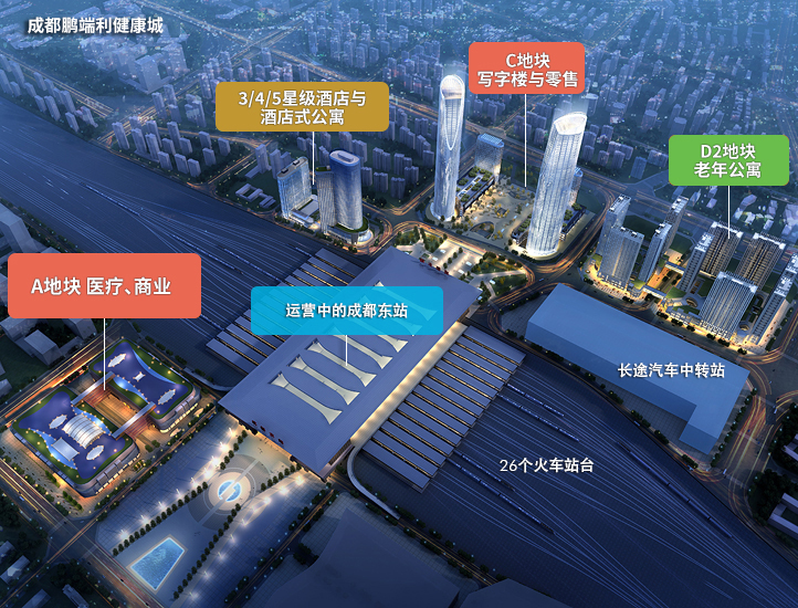 成都东站鹏瑞利健康城A地块包括两座单独但相连的建筑,总建筑面积超过29万平方米,目前已有多家医疗机构入驻,包括循上·鹏瑞利医院、成都瑞杏鹏瑞利医院、成都顾连锦成康复医院、爱帝宫国际母婴月子会所、联影影和医学影像诊断中心、新华健康体检中心、成都成华鹏信医疗护理中心和成都鹏瑞利专科医疗中心此外,成都东站鹏瑞利健康城A地块还提供各种餐饮店、体育设施和配套服务。